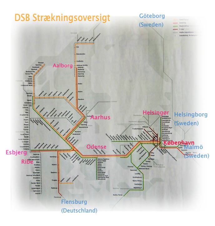 DSBの車掌に何度か地名を聞いてみましたが、どうも聞き慣れない母音。ドイツ語と仲間の言語らしく『Ö』とデンマーク語の『Ø』は同じ音と習ったような気がしますが、子音が混じったり実際に聞くと??