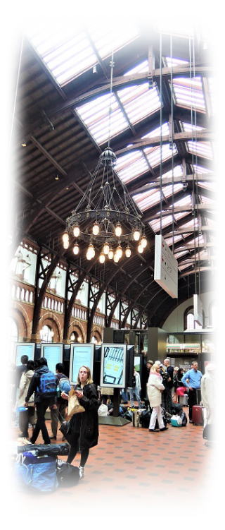 コペンハーゲンから列車で小一時間の終着駅。港方面の出口は小振りですが、天井の木枠装飾やシャンデリアから開業当時の繁栄がしのばれます。