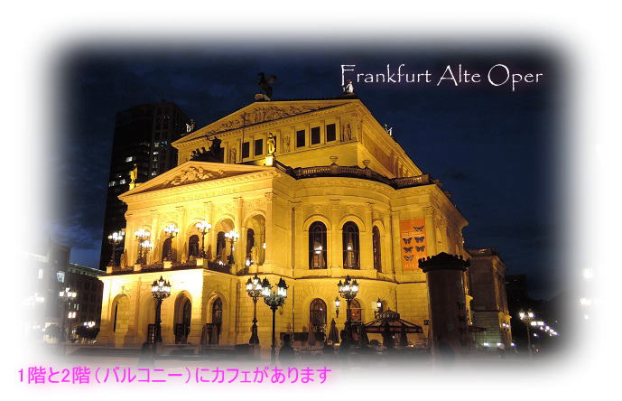 夜間ライトアップされたアルテ・オーパの1階・2階のカフェも、演奏会の跡の歓談を楽しむ場所として良い感じです。